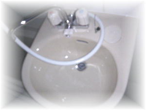 洗面台たらい・水洗金具・棚・鏡・床 |