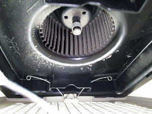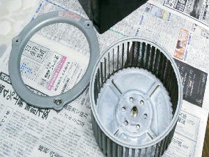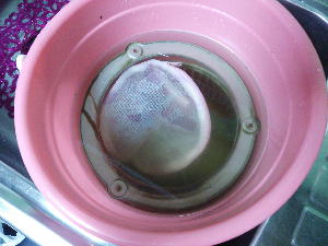 | レンジフード内部は油汚れがいっぱい | 古く固まった油汚れは削り落とします | ドラムは漬け置きして油汚れを浮かせます | 洗浄後、潤滑油をつけて試運転して完了です |
